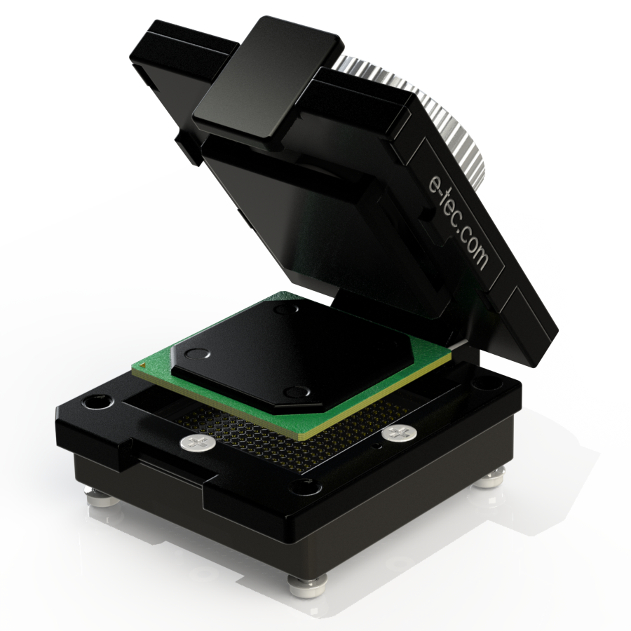 Burn-in Socket Open Top Style. Accommodates Chip Scale Package with 0.80 up to 0.99mm pitch. Compact size and low actuation force. 4-point pinch design for enhanced electrical contact. Field exchangeable package location plate. "U" contact supports any pad or solder ball shape and composition.